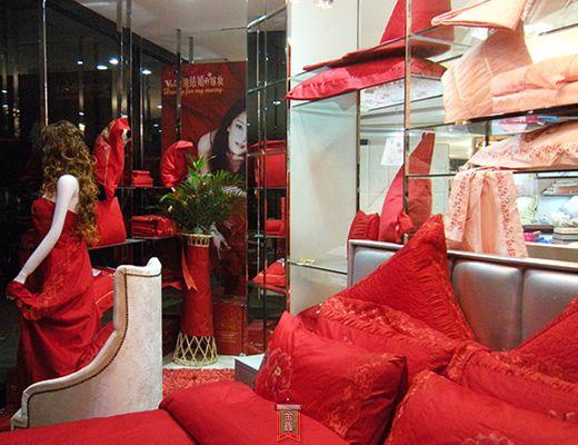 走進(jìn)紫羅蘭家紡汨羅專賣店,一股典雅高貴的簡約之風(fēng)迎面撲來。進(jìn)門左手邊,正對視覺的是一套喜結(jié)良緣床蓋六件套,它運(yùn)用了中國傳統(tǒng)的服裝元素,大紅的唐裝布,華貴的金色飾邊,嬌艷飽滿,立體感強(qiáng);枕面和被面上極富中國韻味的牡丹圖案,給人營造出強(qiáng)烈的視覺感。